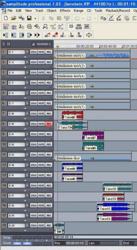 В каждой дорожке записано по маленькому кусочку и не с начала (см. картинку). При сохранении Samplitude создает файлы, в которых содержатся эти кусочки. Но ведь эти кусочки надо еще и расставить (при импорте, скажем, в Reason).