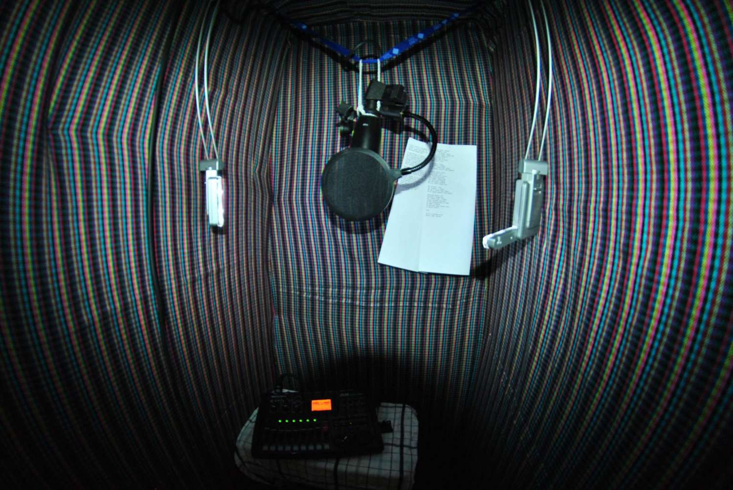 Шкаф Нарнии, как я его называю. Я взял шкаф (примерно 60х80), обложил по 2 стенкам и дверь пенополиуритановыми ковриками, заднюю стенку сделал и свободно свисающей ткани в 4 слоя, сверху на всё прикрепил ткань для красоты. Повесил микрофон, воткнул всё в порто-студию. Сверху и снизу сделал отверстия для вентиляции+поставил под ноги настольный вентилятор, который включаю в перерывах между записью. Получилась тесная комнатка для записи голоса, которая меня очень выручает. Звукопоглощение прекрасное, изоляция не очень, но пишу по ночам, когда дети спят, поэтому считаю, что с этим показателем в норме. От соседей жалоб не было.