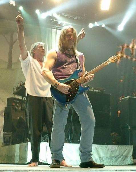 4. Инструмент и отношение к нему. Мне нравится его франкештейны с 4-мя звукоснимателями и кучей тумблеров. Делается не ради понта, а для реальных потребностей разнообразия в звуке и удобства переключения. Уважительное отношение к инструменту. Его первый именной мьюзикмэн до сих пор с ним. Никаких разбиваний и соожений гитар на сцене - тоже в плюс.