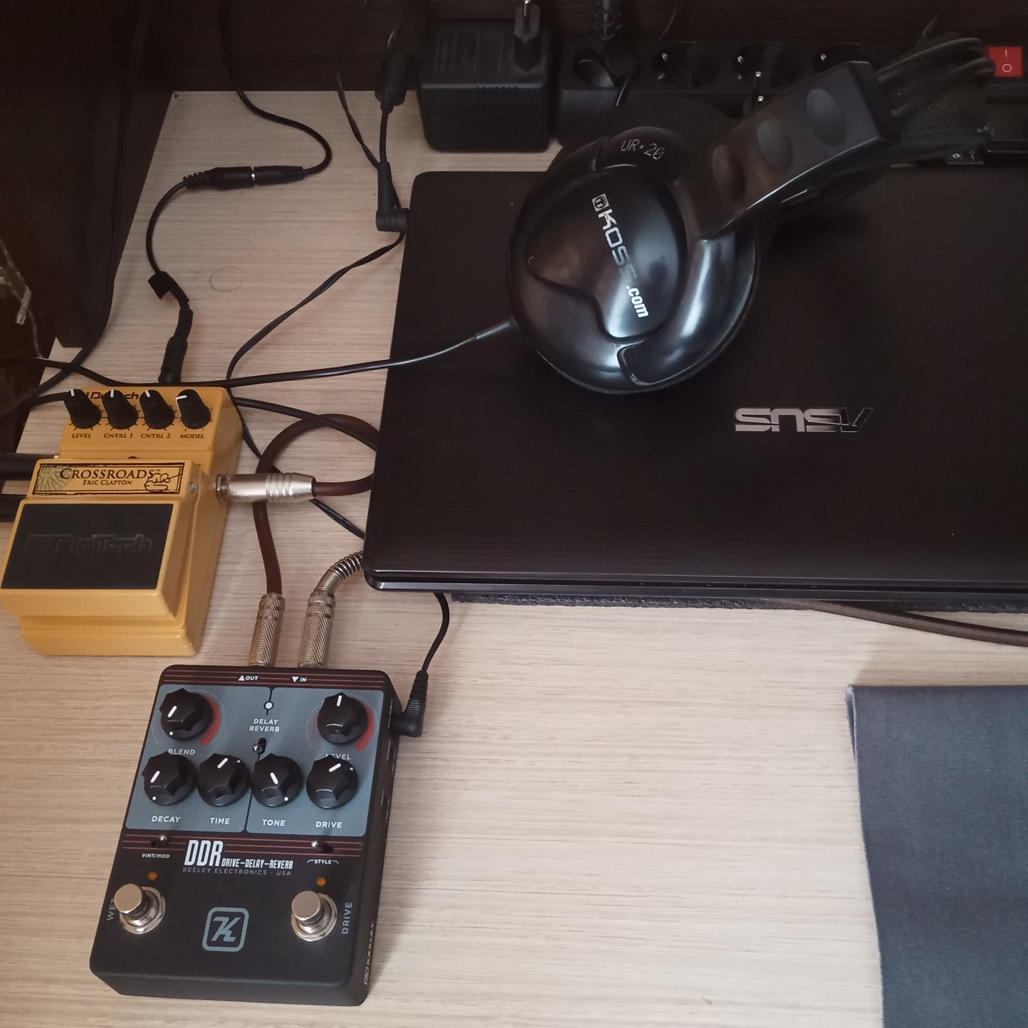 Обычные колонки мультимедийные, не мониторы даж, иногда в наушники AKG K240, у меня карта Zoom UAC-2, она задержку очень маленькую дает, руками я ее вообще не чувствую