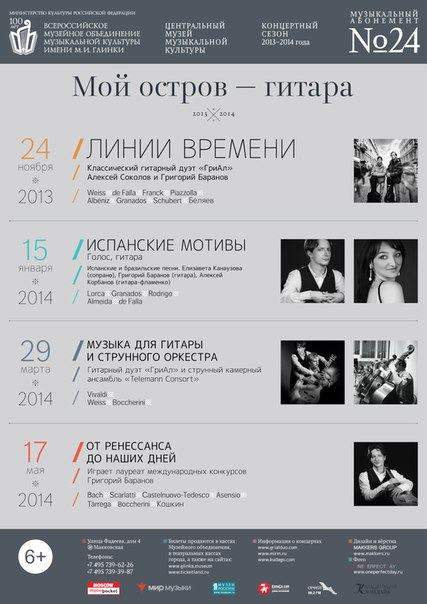 2. 15.01.2014. «Испанские мотивы. Голос, гитара…». Испанские и бразильские песни. Елизавета Канаузова (сопрано), Григорий Баранов (гитара), Алексей Корбанов (гитара-фламенко).