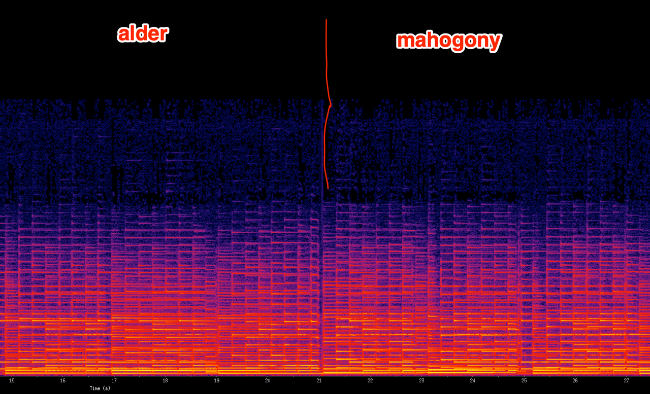 Некоторые утверждают, что более 50 процентов звука в дереве. А некоторые — более 80. А мне по спектрограмме (и моим ушам) кажется, что не более 10 в лучшем случае.