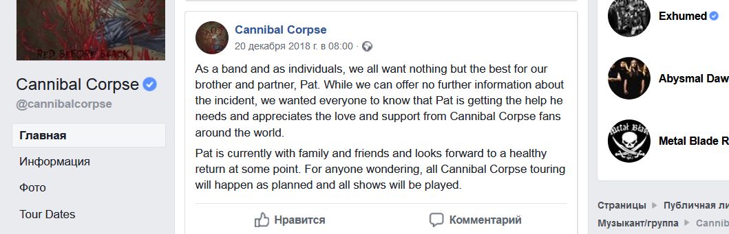 По сообщению WFTS-TV, гитарист CANNIBAL CORPSE Patrick "Pat" O'Brien вломился в дом и напал на полицейских с ножом.