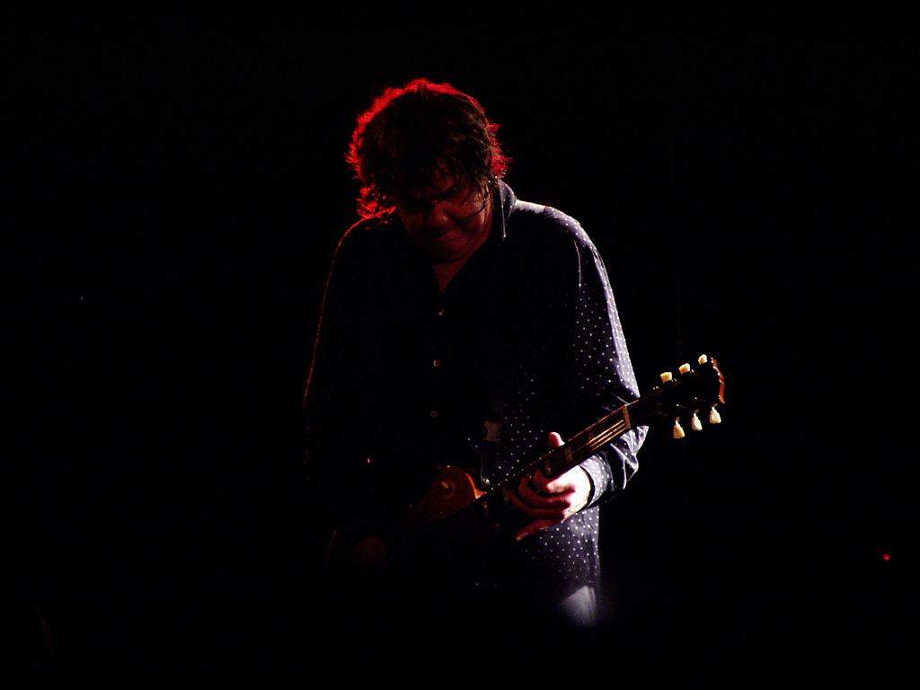 У меня был DVD с его интервью после концерта, или перед, я уже не помню. Так вот, там он болтал что–то, держа эдакого синего роландовского монстра, у него ещё гриф не параллельно деке шёл, а типа вот этого __/