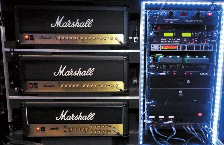 3 Marshalls, ISP Decimator, TC Electronic G-Major, Cry Baby DCR-2SR, Voodoo Lab GCX Audio Switcher