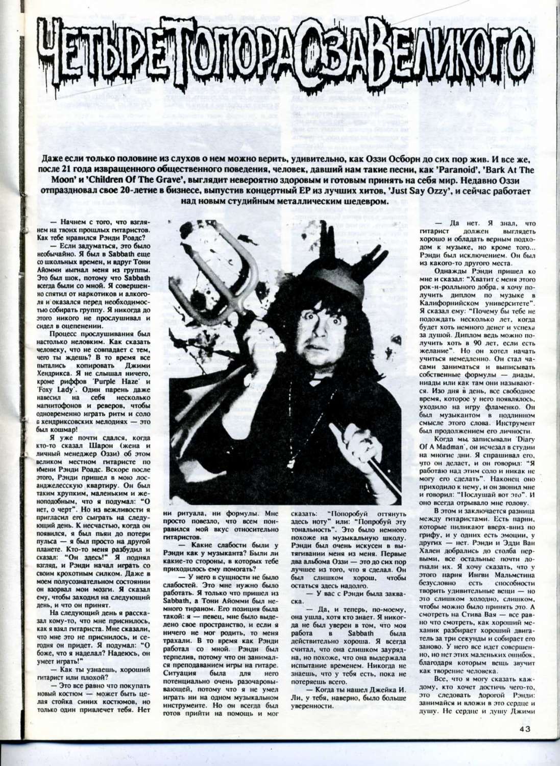 “Возможно, в будущем мы опять что-то запишем вместе. Слушай, если Ozzy попросит меня купить ему яйца с молоком для омлета, я беспрекословно встану и пойду в магазин. Такие отношения у меня только с двумя людьми - с мамой и Ozzy. Моя любовь к ним не имеет границ и я сделаю для них абсолютно всё, что угодно”.