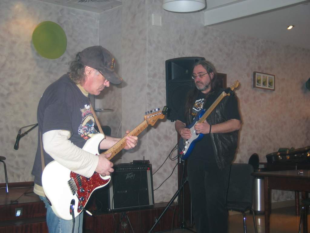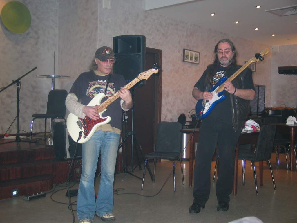 ) Как-то справляла соседка деньь рождения и пригласила разных бардов, а у меня был в гостях Пётр Красов. Мы подождали пока они вышли на площадку покурить и тоже вышли открыв двери моей квартиры настеж и представив бардовскому взору комнату где вдоль стен и на стенах 17 гитар, да ешё каких. Короче все барды ушли ко мне , а когда вернулись к Ленке, то так меня хвалили, что она поняла, что это не у меня не получается, а это до неё не доходит. Не скажу,что мы подружились,но стади враждовать меньше. Среди бардов был скрипач Олег и его жена устроительница фестов и я поставил им свои записи, и им понравилось. Олег предложил поиграть вместе,аего жена сказала,что скоро есть фест на 3 дня в домеотдыха в Подмосковье и она нас туда воткнёт. Всех делов 4 песни на второй день. Мы собрали команду Олег(скрипач), я , Венцеслав, и моя жена (поёт не очень,но все слова знает и выглядит хорошо), дабольшетам и не надо - бардовский фест ведь. Я ещё пригласилжруга Виталика с женой - правдаони платили, а мы на халяву вдомотдыха,даещёииграть-то всего 2 раза во второй день (2 песенки дневной концерт и 2 вечерний).Венцеслав, взял 2ух сыновей и я взял своего (славин старший Славин - следил за малышами). Корочевсёрасполагало ккласснымпоседелкам в первый день , не сложным выступлениям на второй и прощальной попойке на третий).Короче оттяг на халяву,да ещё и в не плохом месте. Бухламыприхватили из дома, но мало . Когдаорганизоваливномере стол,то поняли,что бегать вмагаз будет влом, а чтоб посидеть нормально на 7 взрослых МАЛОВАТО БУДЕТ ипослали мою жену в магаз (самая молодая,а магаз в 2ух км. от дома отдыха и на дворе зима). Ещё до накрытия стола, я сходил на саунд-чек и оставил там свой страт (ну звукач был знакомый и я попросил посторожить), а потом после концерта (в первый день мы не играем) пусть занесёт в номер и вместе побухаем. Короче жена принесла всё, что надо было, мы сели начали отмечать - ВСЁ. Когда мы ужеизрядно поднажрались, я вдруг забеспокоился , о страте и решил всё-же сходить за ним. Когда яподошёл к звукачу (спросить где страт),тот спросил - НУ, ВЫ ГОТОВЫ? К чему (спросил я)? Вы через одних выходите, группа "Королева кухни " не приехала и вас вставили в программу вместо них... Я аж охренел ивообще всё,что бывает после ОХ... а в конце ЕЛ