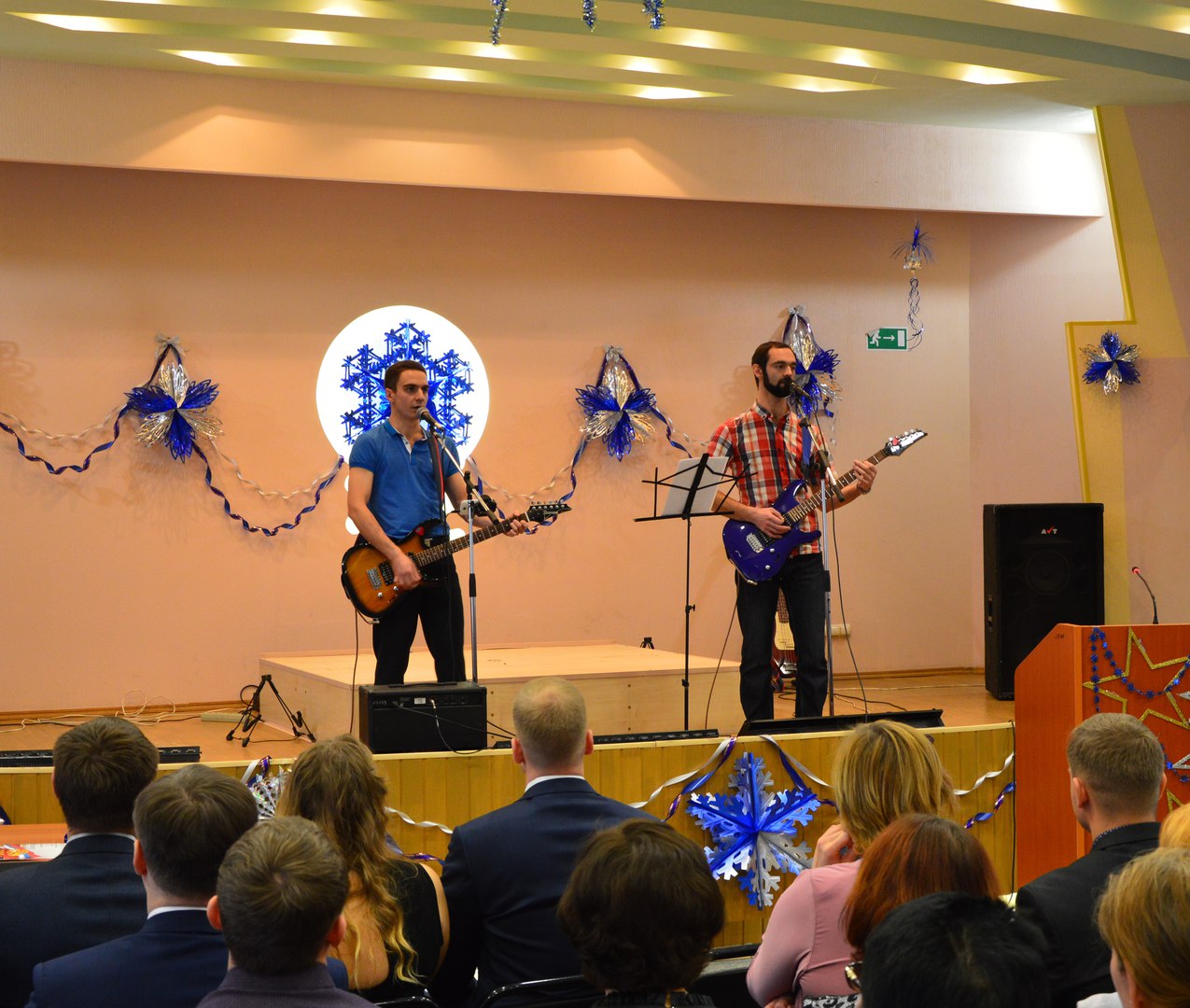 В группе гитара и бас гитара Мы же оба вокал. Долгое время с басистом искали барабанщика, и клавишника. Пока искали, партию ударных пускали минусом, набранные в фрути-лупсе. Наша реп. база - актовый зал средних размеров, чуть меньше стандартного школьного спортзала, сцена метра 3-4 на 10-12. Усилятор ROSTEX 1200 и две большие пассивные колонки. Колонки стояли по углам сцены, направлены к центру зала. Мы стояли у края сцены в центре, колонки немного позади. Никаких проблем с наруливанием звука не испытывали. Мощности усилка хватало, чтобы замечательно озвучивать полный зал народа, без намека на фидбек и посторонние шумы... Громкости везде были придавлены, и вобщем-то все было ок. Себя слышали прекрасно, мониторы были не нужны.