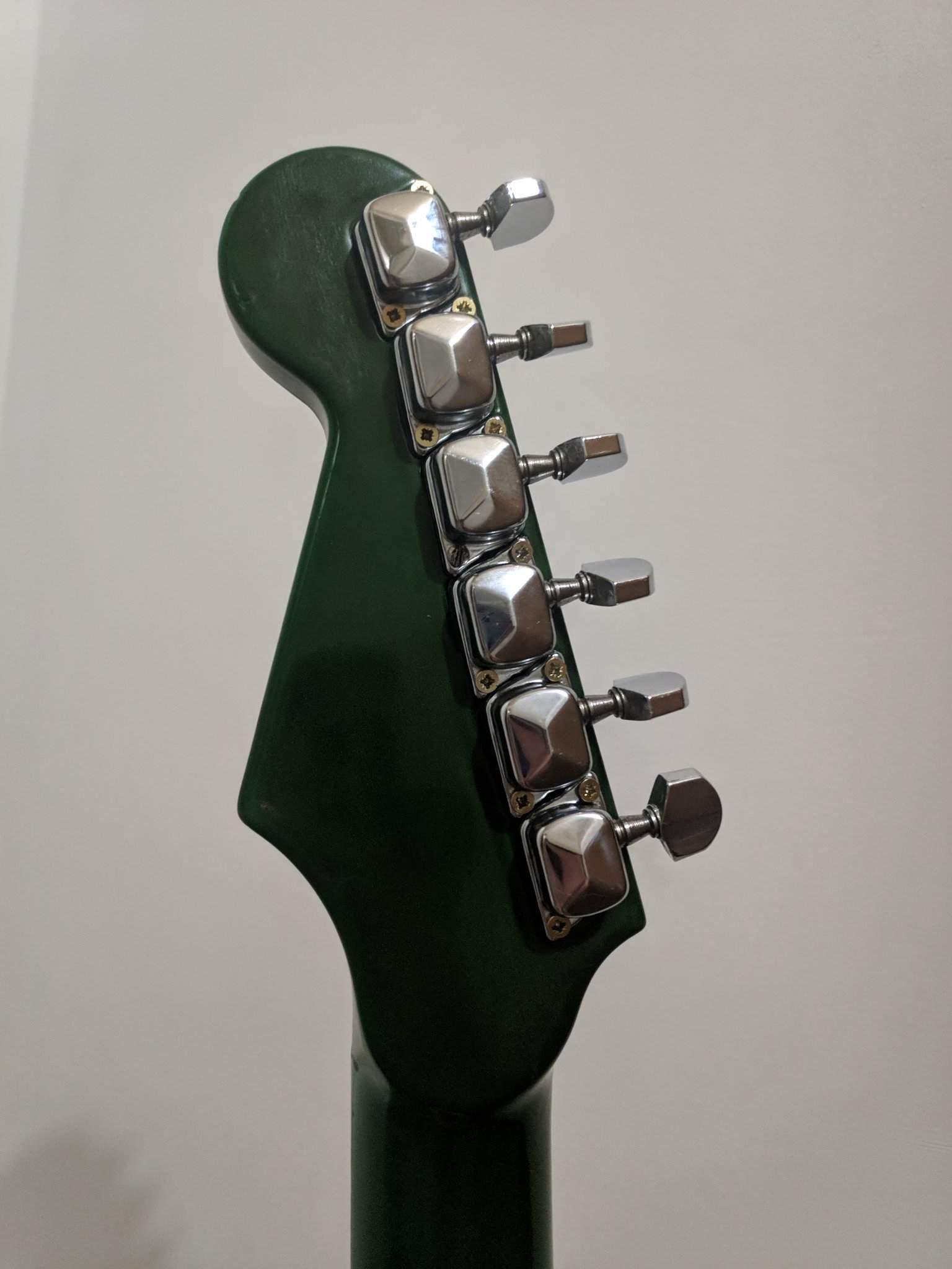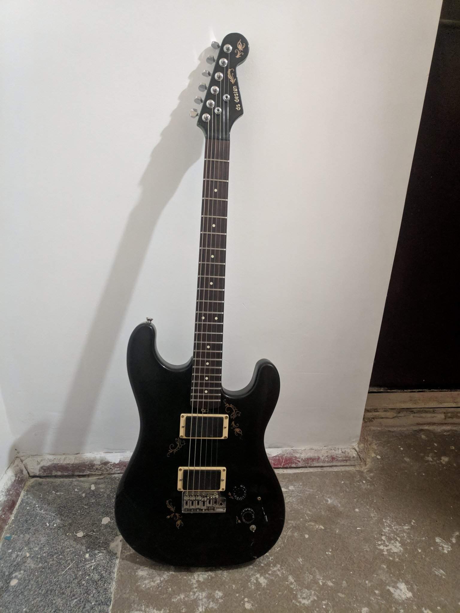 Голова как у фендера, но капля поменьше(чем у стандартной, как мне кажется), анкер снизу. Форма стратокастера, с вырезом под пузо и скосом под руку, без накладки(пикгарда), очень тяжолая весом килограм 5-6, по электронике , полностью перевырезаная и перепаяная на Н-Н emg hz h3, но до этого было 3 выреза под звукосниматели... Средний зашпаклёван. Фурнитура хорошая литая, ретейнеры круглые, накладка полисандр, лады поменяны на стальные, в конце грифа вырез под колесо анкера, ниже датчики и фендеровский бридж. На уровне начала бриджа волуме , и на конце бриджа под углом 30градусов от волуме крутила тоне, паралельно им стоит тудасюдашка на 5 позиций. Отверстие под Джек внизу на углу гитары. По форме деки похожа на "Peavey Tracer 2 USA. 1989" , но повторюсь голова грифа формой фендера. Ззаде гриф на болтах под анкерный шестигранник с металлической пластиной с отчеканены номером "042296" , и 2 пластиковых чёрных защитки под электронику(формы прямоугольного овала) и брыдж.