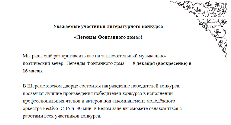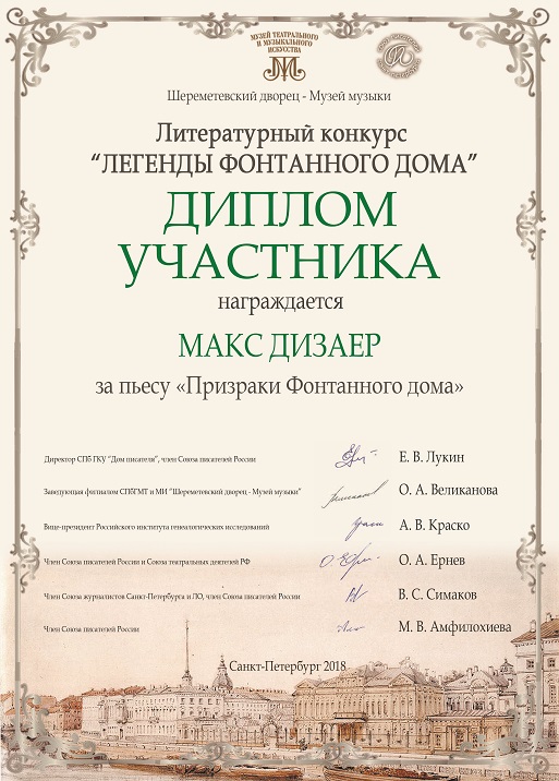 принимал участие в конкурсе и в победители не попал, но мое произведение гусарский романс отдаленно напоминающий стиль Blackmore’s Night вместе со всеми произведениями прошедшими отбор будет показано посетителям музея Фонтанного дома 9 декабря.