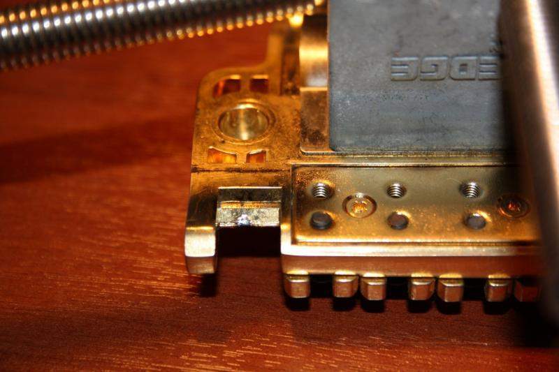 2) после долгих думок я решил попробывать вытащить правый ножик и с приличным усилием маленькими плоскогубцами я его вытащил, он вытаскивается вправо стрелочкой показано. Затем этот ножик я перевернул заточенной стороной от опорного болта и другая сторона была готовой заготовкой для новой расточки,и она же идеально встала обратно в машину. Взяв надфиль я расточил такой же угол наклона как и на первом ноже, аккуратно не спеша держа нож одной рукой в плоскогубцах в другой надфиль, оставив совсем немонго запаса я решил поставить и попробывать флойд со струнами, и к удивлению флойд встал просто отлично, смазал маслом трущиеся места, и поставил пружины параллельно друг другу, после этого я помучил струны чтоб встали нормально, закрутил топ локи и УРА-А-А-А! Флойд не токо встает на место и не низит строй но еще и четко Фурляет как должен работать нормальный японский флойд Edge.