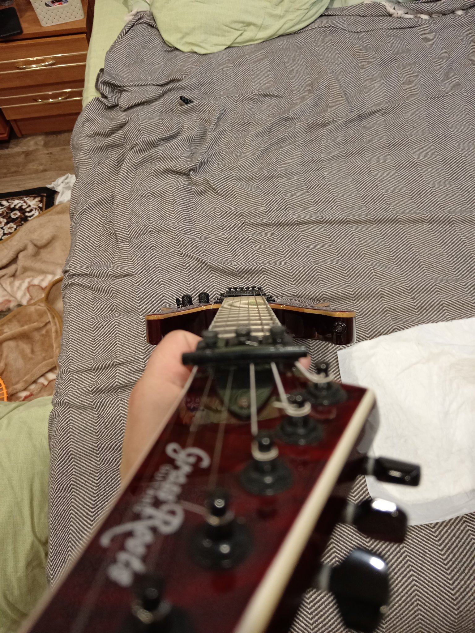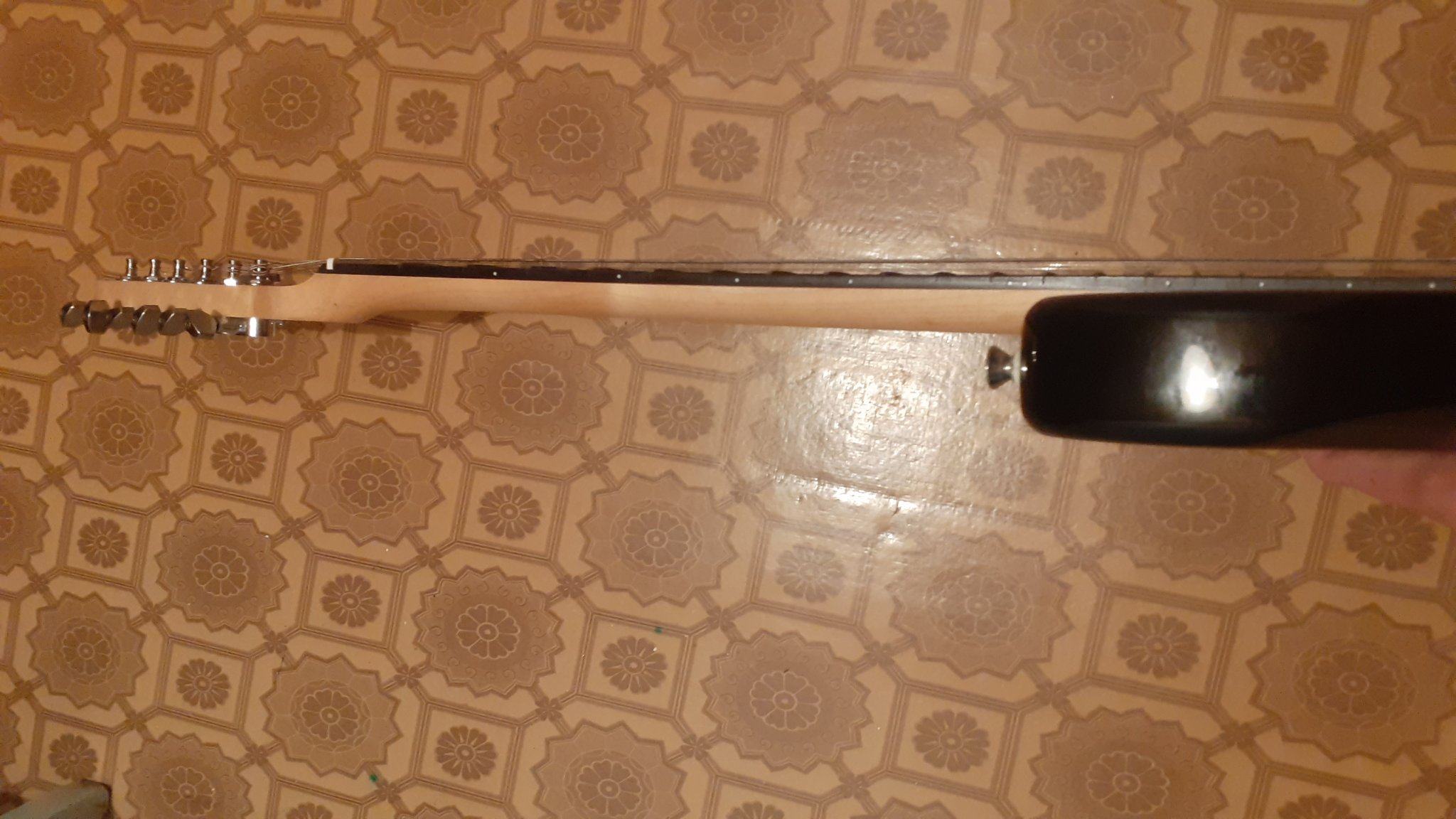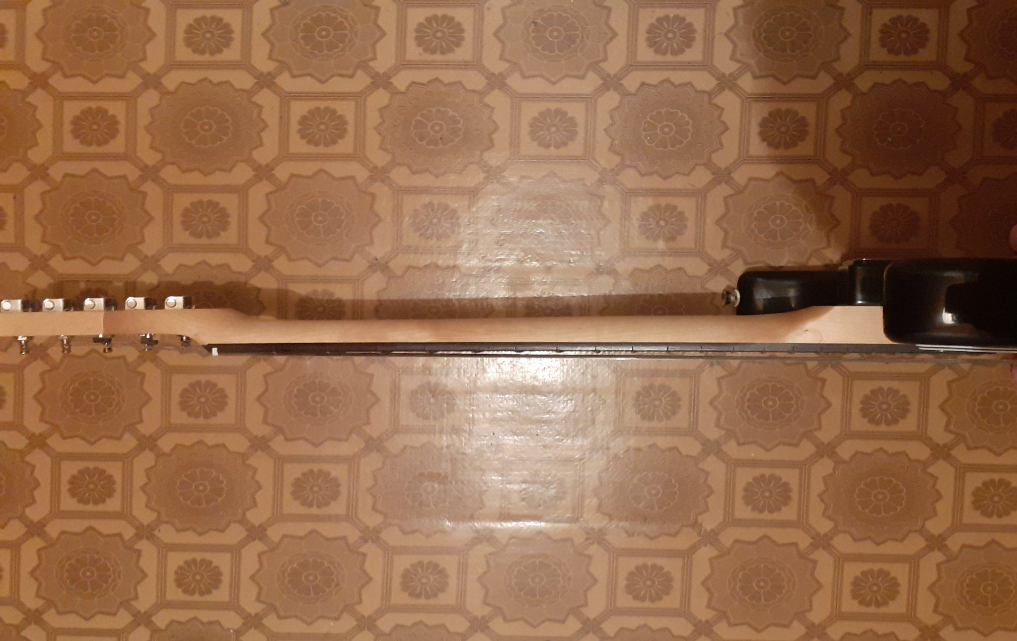 Прогиб большой, но равномерный, вроде.... и добавил:Похоже, что гриф не кривой, просто гитару отстроить надо.