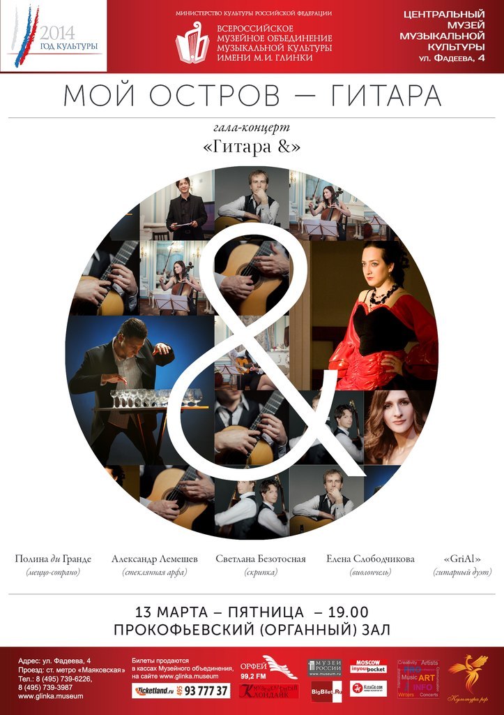 гала-концерт "Гитара &". Вечер ансамблевой музыки, где гитара будет звучать в дуэте со скрипкой, вокалом, стеклянной арфой (игра на бокалах!) и виолончелью в исполнении известных музыкантов и артистов!