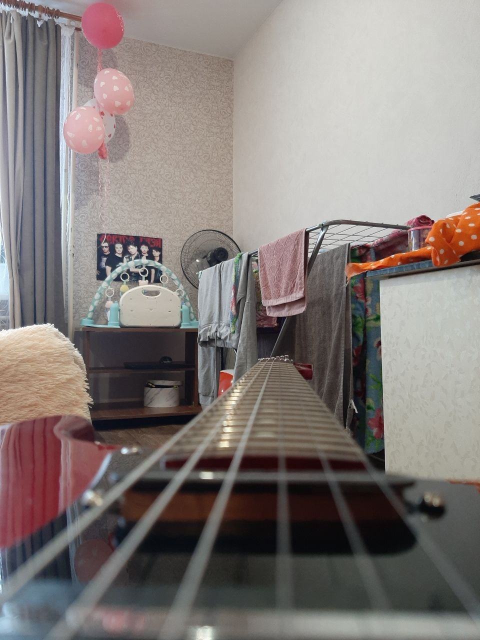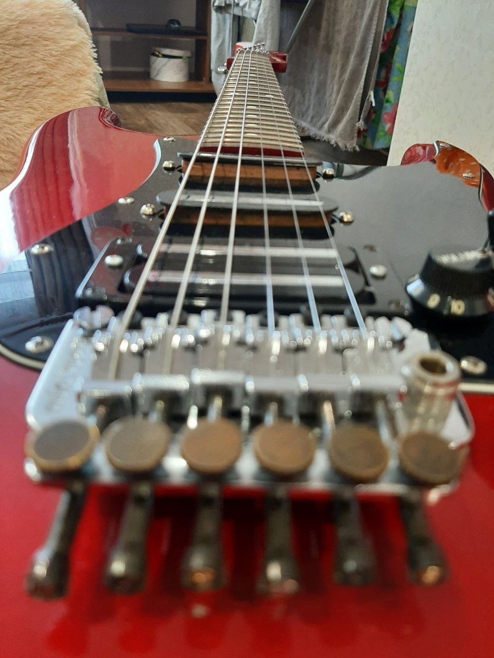 Еще может сбивать с толку высота струн. у шестой и у первой она наверняка разная, и от этого может мерещиться.