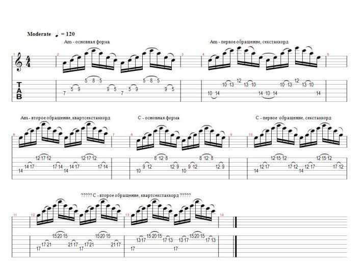 Решил я до конца разобраться для себя в различных вариантах апликатур мажорных и минорых трезвучий, а также их обращений, позволяющих исполнять их различными техническими приёмами - свипом, переменным штрихом и легато. Кроме развития техники, это будет полезным и для визуализации грифа, так как арпеджио является промежуточной структурой между октавными скелетами и гаммами. Да и путём добавления в эти апликатуры дополнительных нот тех или иных интервалов, можно легко получить арпеджио септ-, нонаккордов и т.д. Ну и, опять же, каждая форма арпеджио обрастает своим вариантом апликатуры соответсвующей данному аккорду гаммы.
