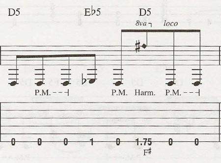 Кстати, это девятая гармоника: нота "фа-диез" (основной тон + три октавы с большой терцией). Обычно это G♯, но здесь шестая струна понижена на тон, отсюда и обозначение F♯ в табулатуре.