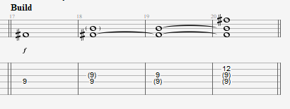 - 20-ый такт: извлекается только F# на 2-ой струне, остальные просто продолжают звучать.