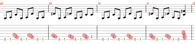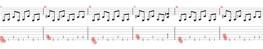 Со вступлением все понятно, там несложно задрочиться, а вот здесь есть вопросы. Сама структура рифа такая, что именно помеченные красным ноты удобно считать. Они меняются и не запалмьючены, они акцентированы и на них хочется опираться.. Но ясен-красен так это не работает.