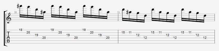 Залигуй (пулом) две первые ноты каждой нотной фигуры из четырёх нот под одним ребром, остальные находятся на нижних струнах - зажимай их приёмом полубарре (левой рукой - если ты правша), т.к. пытаться переставлять пальцы будет непрактично, а звукоизвлекай их с помощью свипа, медиатором снизу вверх - и так, кстати, все ноты отрывка, кроме каждой второй, которая будет извлекаться залигованным сдёргиванием (пулом).