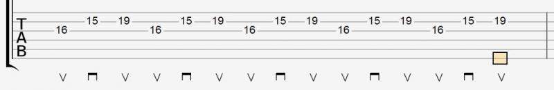 Всем, наверно, хорошо знакома эта композиция ВИА Metallica. Не самая сложная технически, но есть в первом соло один очень (для меня по крайней мере) геморройный момент. Табы прилагаю. Играется 16-ми при темпе 128, две ноты на второй струне одна на 3-й. Этот кусок, блин, меня с ума сводит, бьюсь с лета. Если играть его переменным штрихом, то на нота на 3-й струне постоянно меняет направление штриха. У меня получается сыграть чисто только в темпе 116, ну не получается быстрее и все тут. На полной скорости нормально и чисто звучит если играть кусок экономом и достаточно слитно получается по звучанию (картинка номер два).
