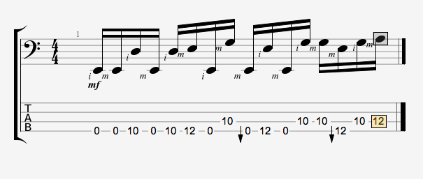 Есть партия бас-гитары к песенке "Hysteria" ВИА Muse. Играется пальцами. И вот в этом фрагменте, который на рисунке, переменный штрих поневоле сбивается (эти места помечены стрелками), так как средний палец хочет подряд играть две струны, хотя очередь указательного. У меня именно в этом месте проблемы, и я подозреваю, что как раз из-за этой сбивки. Отсюда вопрос – нужно ли стремиться играть всё переменным штрихом или позволить меняться пальцам в этих местах?