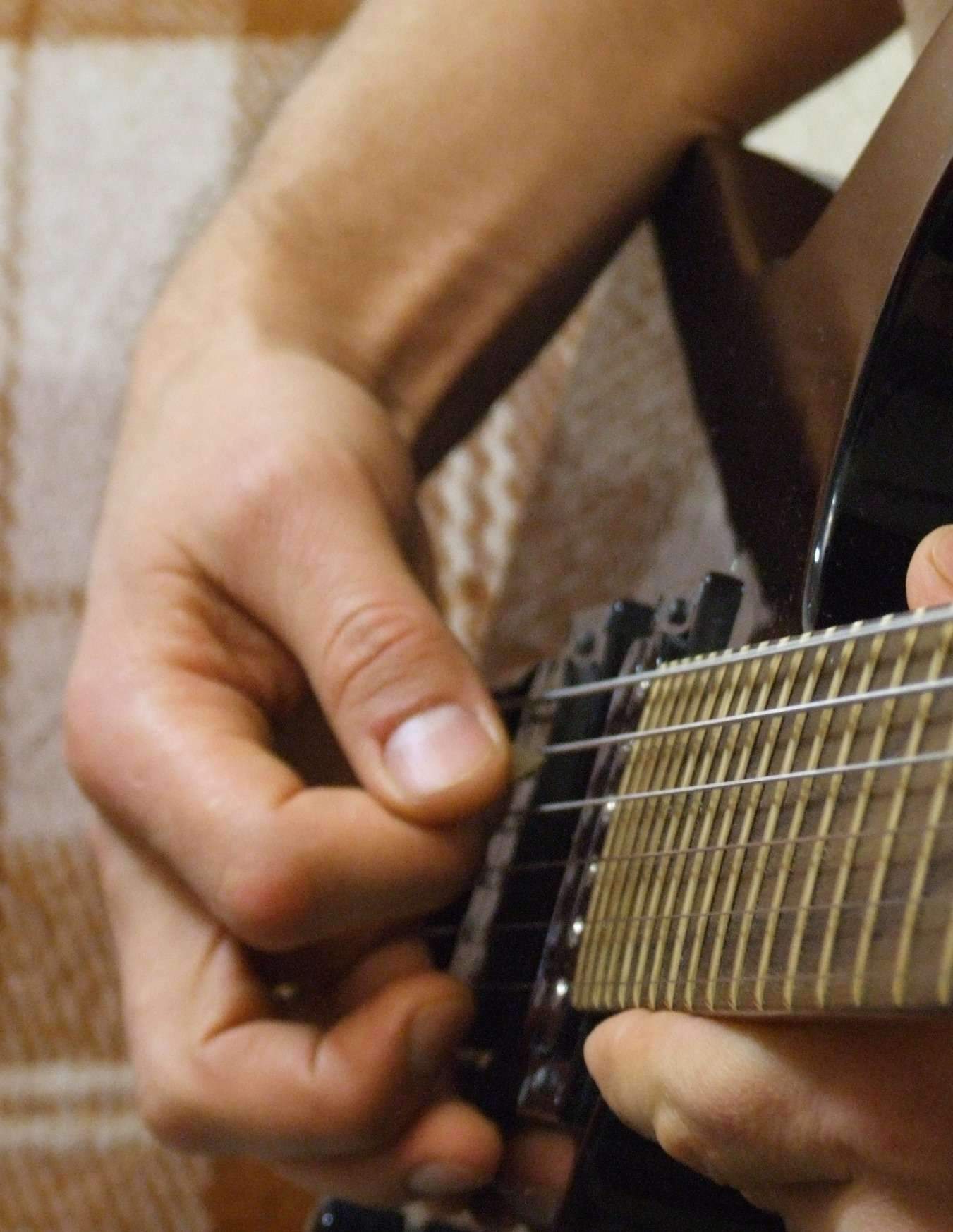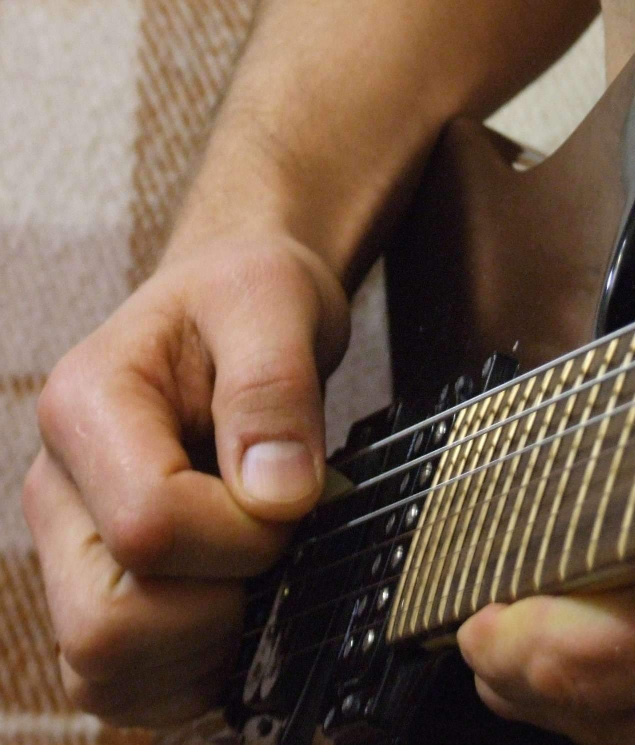 При этом при игре на 5 и 6 струне в такой постановке ноготь указательного пальца постоянно задевает за нижнюю от играемой струны, но т.к. эта струна глушится, то это и не слышно