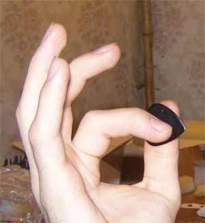 @Ilya@, я так раньше держал медиатор, потом понял, что неудобно, указательный часто задевал за струны, не очень надежная фиксация и если сильно сжать дискомфорт в суставе. Сейчас держу первую фалангу более согнутой (если непонятно могу сфотографировать). Посмотри как держат медиатор Тиммонс и Гован, они держат его очень глубоко, особенно Гован, так что он просто упирается тупым концом и не может выпасть, на некоторых видео можно заметить, что Гован часто просто приподнимает большой палец, но медиатор не вылетает.