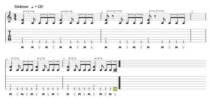 В таком случае акцены (квинтаккорды) извлекаются ударом вниз, который всегда получается более хлёстким и плотным по звучанию, чем при ударе медиатором вверх.