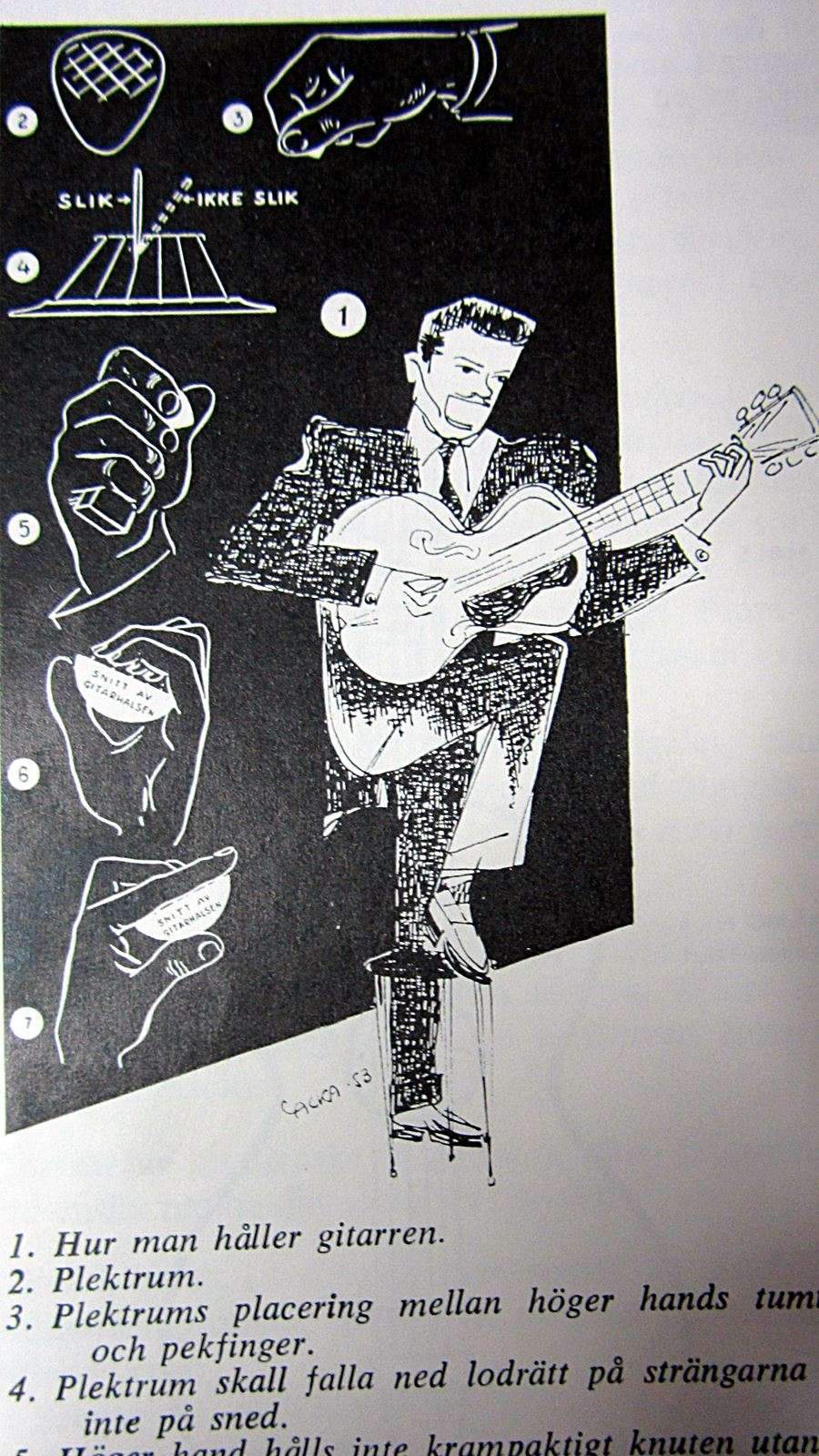 Есть одна очень большая и серьезная книга "Мир Музыки" - Музыка в словах и фотографии, состоящая из 2235 страниц и 2000 иллюстраций, первое издание было в 50х и которая к сожалению на русский не переводилась...Есть там и краткий курс по гитаре - вот из него картинка и по ходу вопрос - что за предмет в руке кроме медиатора на 5й позиции?