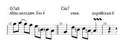 Остается Ля бекар. Во-первых, в джазовой стилистике для минора дорийский звукоряд является базовым. И мыслят часто им, добавляя всякие вводные хроматизмы, проходящие и опевания.