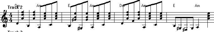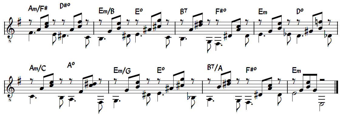 Второй такт. Басовая линия h-d# на Em совсем не подчеркивает, что произошла смена аккорда. Исходя из баса создается впечатление, что тоника (Em) появляется во второй половине вторго такта, когда уже звучит другой аккорд.