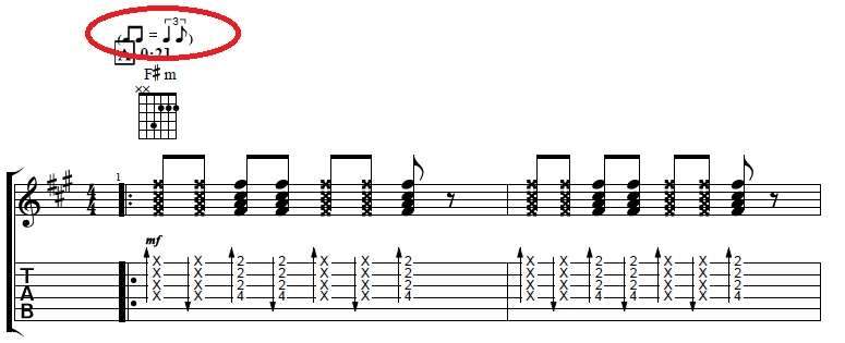 Подскажите, что значит эта ремарка в гитар про? Две восьмые равны триоли из четвертой ноты и восьмой. Как считать эту длительность?