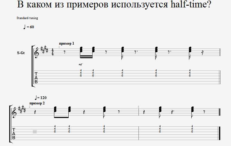 Отвечая на последний вопрос, любой из предложенных тобой примеров может походить. Сам вопрос поставлен неверно: нужен исходный образец, (то есть относительно чего халфтайм). Но определенно второй пример является "халфтайм версией" первого! Технически он звучит также. Просто его удобней прочитать. Надо понимать, что half time (как и double time) - всего лишь техника записи/понимания ритмического рисунка. Так многие начинающие, играя сложные ритмы с 1/16-ми, отстукивают на 2 ноты, для более простого восприятия (double time).