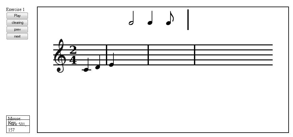 Условия максимально приближены к реальным. Вы слушаете мелодию и должны записать её нотами на нотоносце. Сделано 20 заданий, все в до мажоре и в размере 2/4. При правильном наборе покажется полный вариант нотной записи.