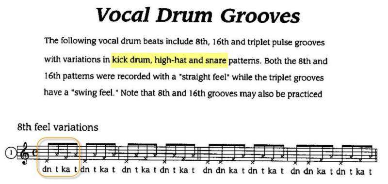 Contemporaiy scat singers frequently use percussive scat syllables to simulate drum beats, particularly in a cappella groups where there is no rhythm section to establish a groove. Stylistic drum grooves can easily be interpreted with a minimal vocabulaiy of syllables starting with the nucleus of the traditional trap set: bass drum, snare and hi hat. While bass and snare syllables are more consistent, a variety of articulations and timbres may be applied to cymbals, in particular, the hi hat. When pressed tightly together and played with a stick, the two hi-hat cymbals will make a staccato sound that can be vocalized with the single-letter syllable t (pronounced Uh). Looser hi-hat cymbals can sound more like tss or tsh (pronounced tiss and tish). Other hi-hat sounds include chik, tsik, tch, tsht and so on. Additionally, there are numerous ride and crash cymbal syllables such as ting, tang, psh and wsh. Toms also may be articulated with the syllable doon with longer .duration and more variety of pitches from high to low. However for the purpose of establishing a groove, bass, snare and hi hat are sufficient.