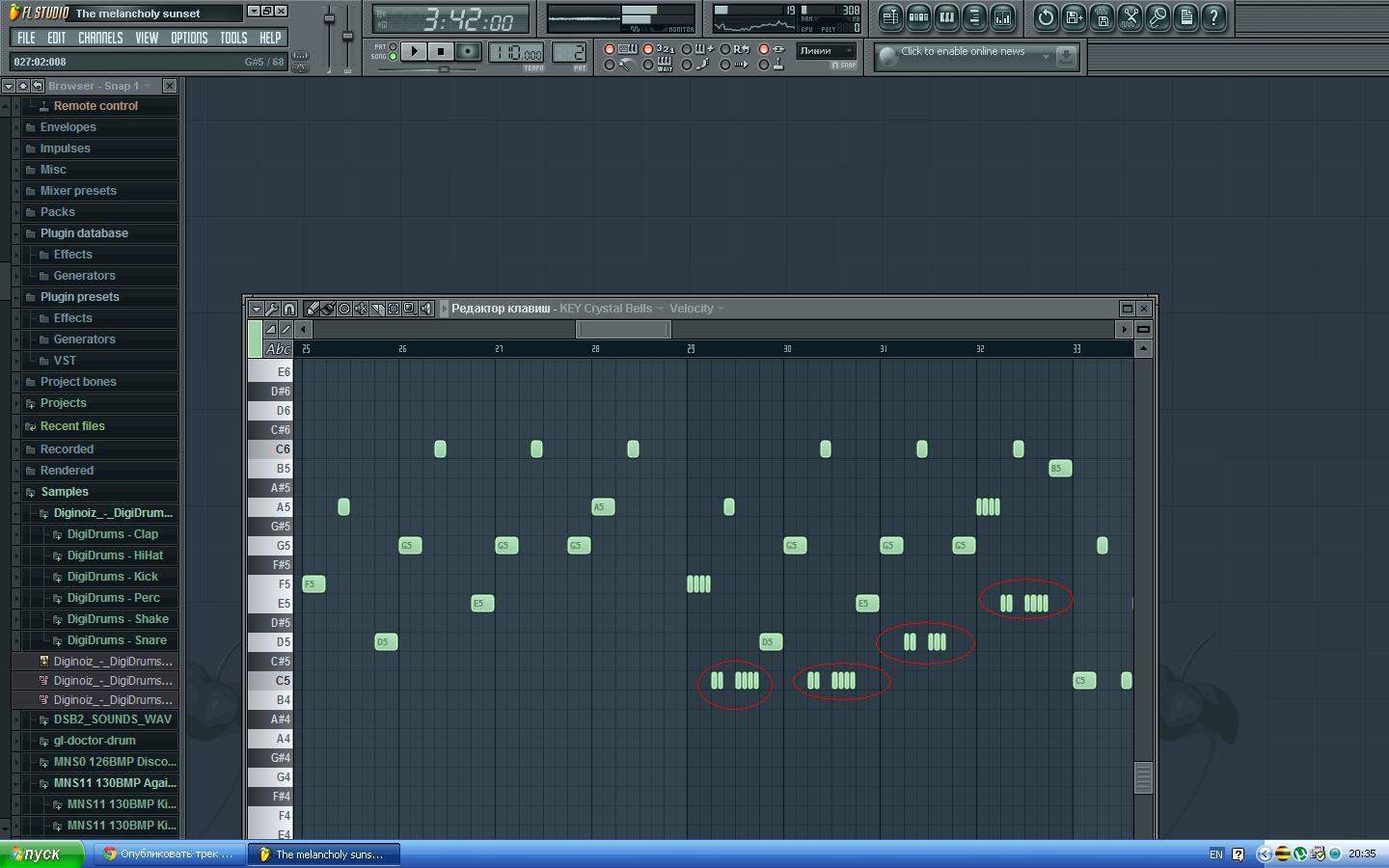 И ещё сделал для себя открытие о том, что могут делать педальные ноты. На моменте, что начинается с 3.42 абсолютно такая же конструкция, что в припеве, который следует за ним. Только вот в припеве я добавил педальных нот в пустые отрезки. А на слух кажется, что совершенно разные мелодии. По крайней мере, на мой. Для ясности приложил картинку этого места из Fl Studio.