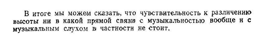 "Это означает, что каждое волокно способно «откликаться» на высоты в интервале, равном 1/50 полутона, что составляет 2 цента (86). И в этом смысле каждый человек имеет абсолютный физиологический частотный слух. Такой же абсолютный частотный слух имеют и некоторые животные. Но этот слух не является слухом музыкальным вообще и абсолютным музыкальным слухом в частности. «Музыкальная психология и педагогика пришли к заключению, что основой музыкального слуха является ладовое чувство".