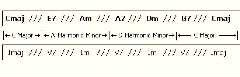 По сути, в твоем примере мы имеем дело с т.н. побочными доминантами. Я бы сказал, что это самый простой, очевидный, "школьный" способ отклонения (модуляции). Но далеко не единственный. Если хочешь получше разобраться с гармонией советую прочитать курс гармонии на сайте 7 нот: