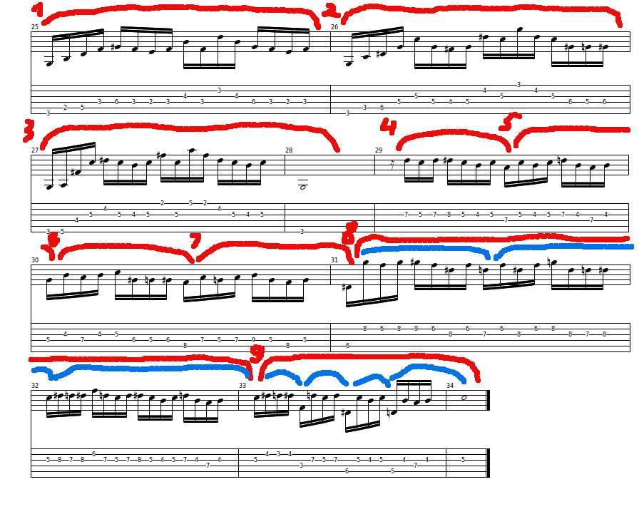 Чтобы не распыляться рассмотрим такты 25-34, которые удачно поместились у меня на 3 странице pdf. Я сделал картинку этого фрагмента.