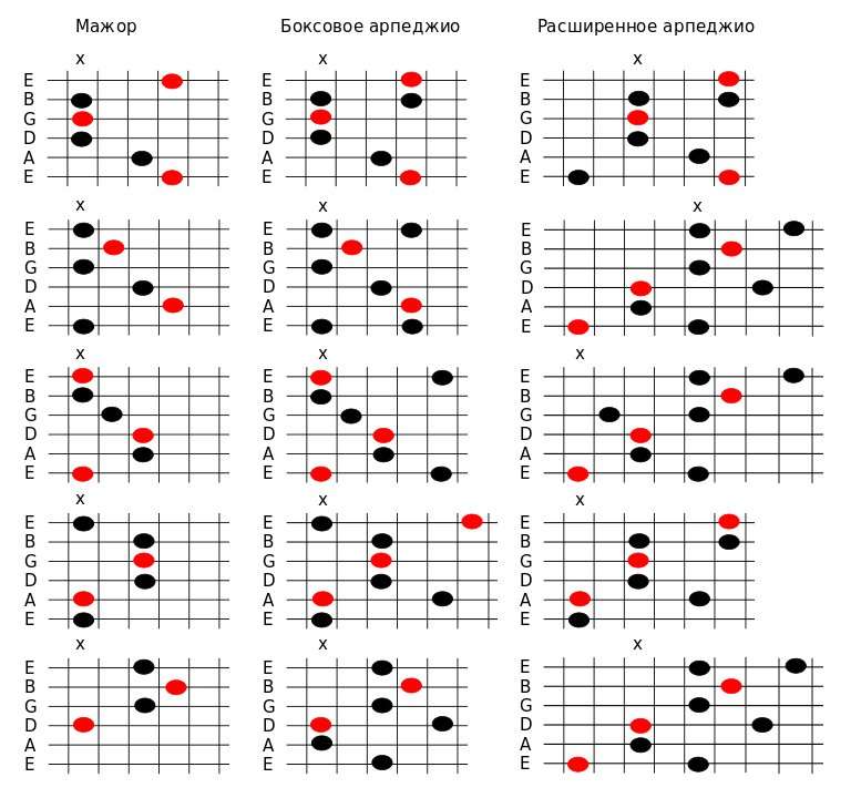 Синими кружочками показаны минорные тоники, красными — мажорные. X — привязка к ладу.  В арпеджио для разнообразия можно вставлять дополнительные ноты методом легато. Это удобно делать там, где содержится 2 ноты на струне. Самый простой вариант — это хроматизмы.