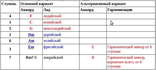 Синими кружочками показаны минорные тоники, красными — мажорные, зеленым цветом выделены альтернативные варианты. X — привязка к ладу.