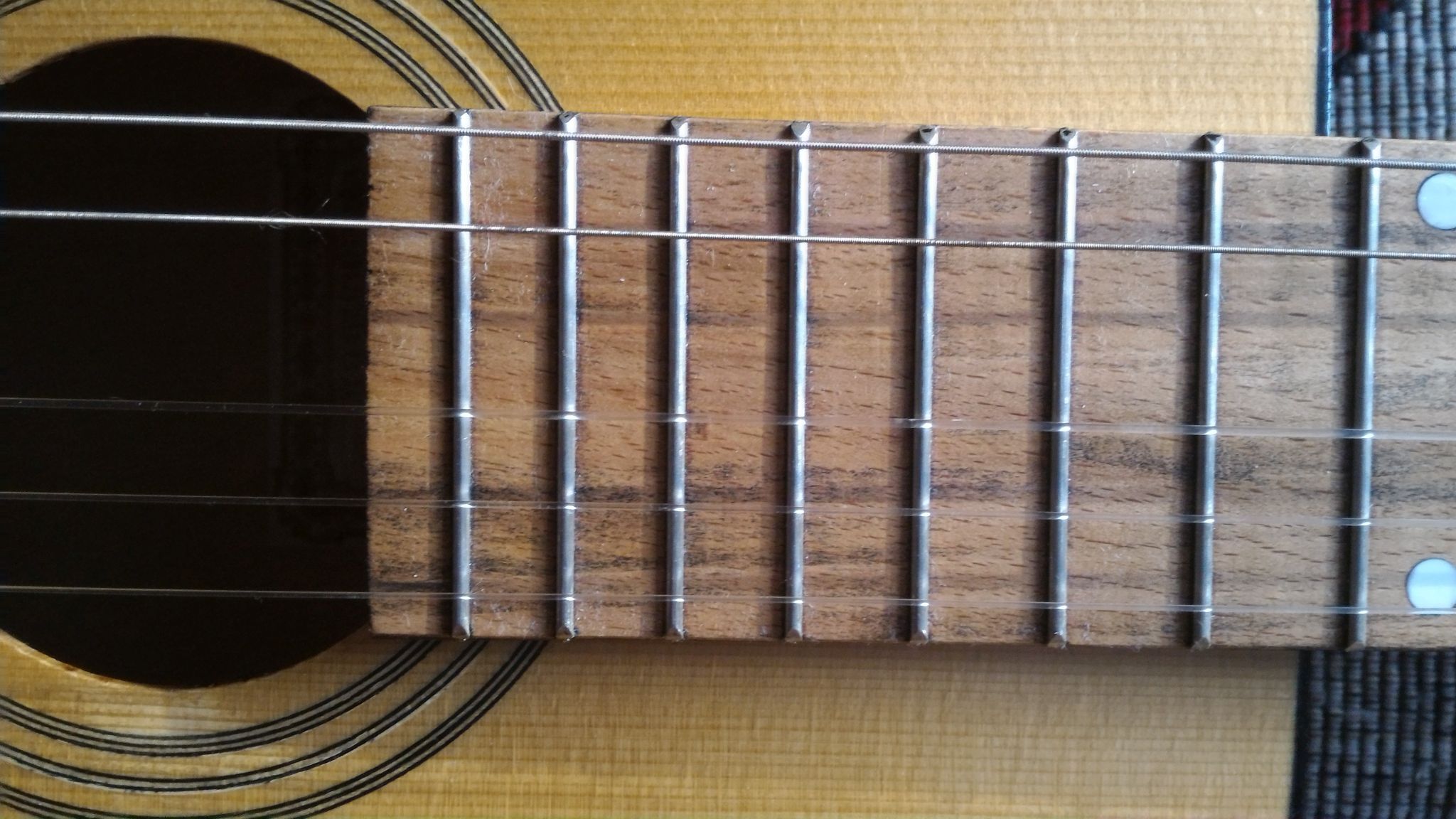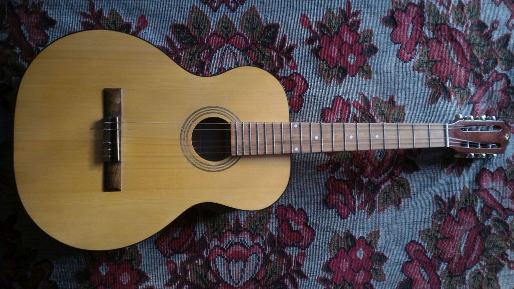 Верхняя дека из массива ели. Корпус - резонансная фанера. Гриф непонятно из чего. Накладка очищена от черной краски.